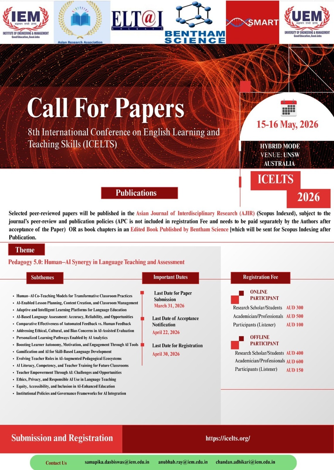 IEM-UEM Group, India takes this opportunity to invite you to the International Conference on English Learning and Teaching Skills 2026 (ICELTS 2026) to be held from 15th to 16th May 2026(Friday-Saturday) in hybrid mode. We encourage you to participate in the conference and submit your paper for possible inclusion and presentation at our conference.